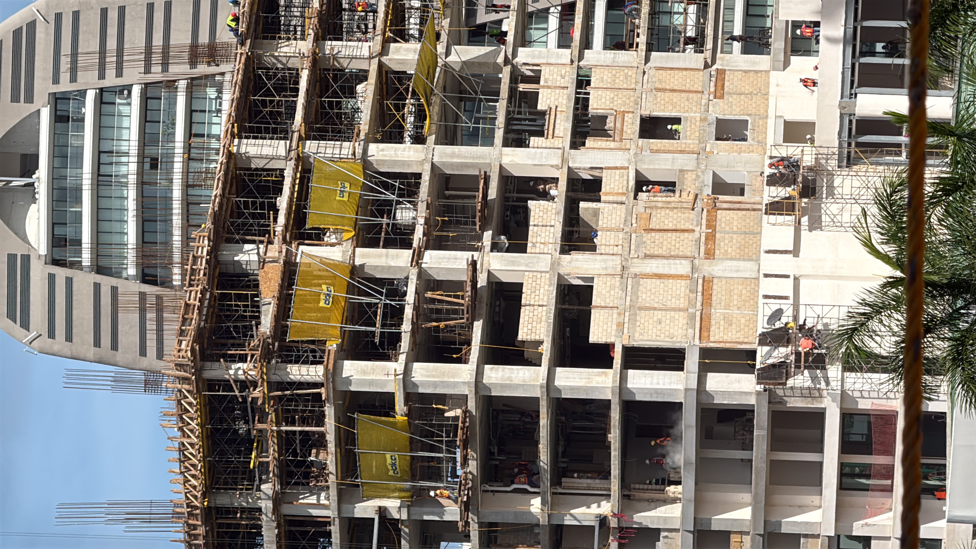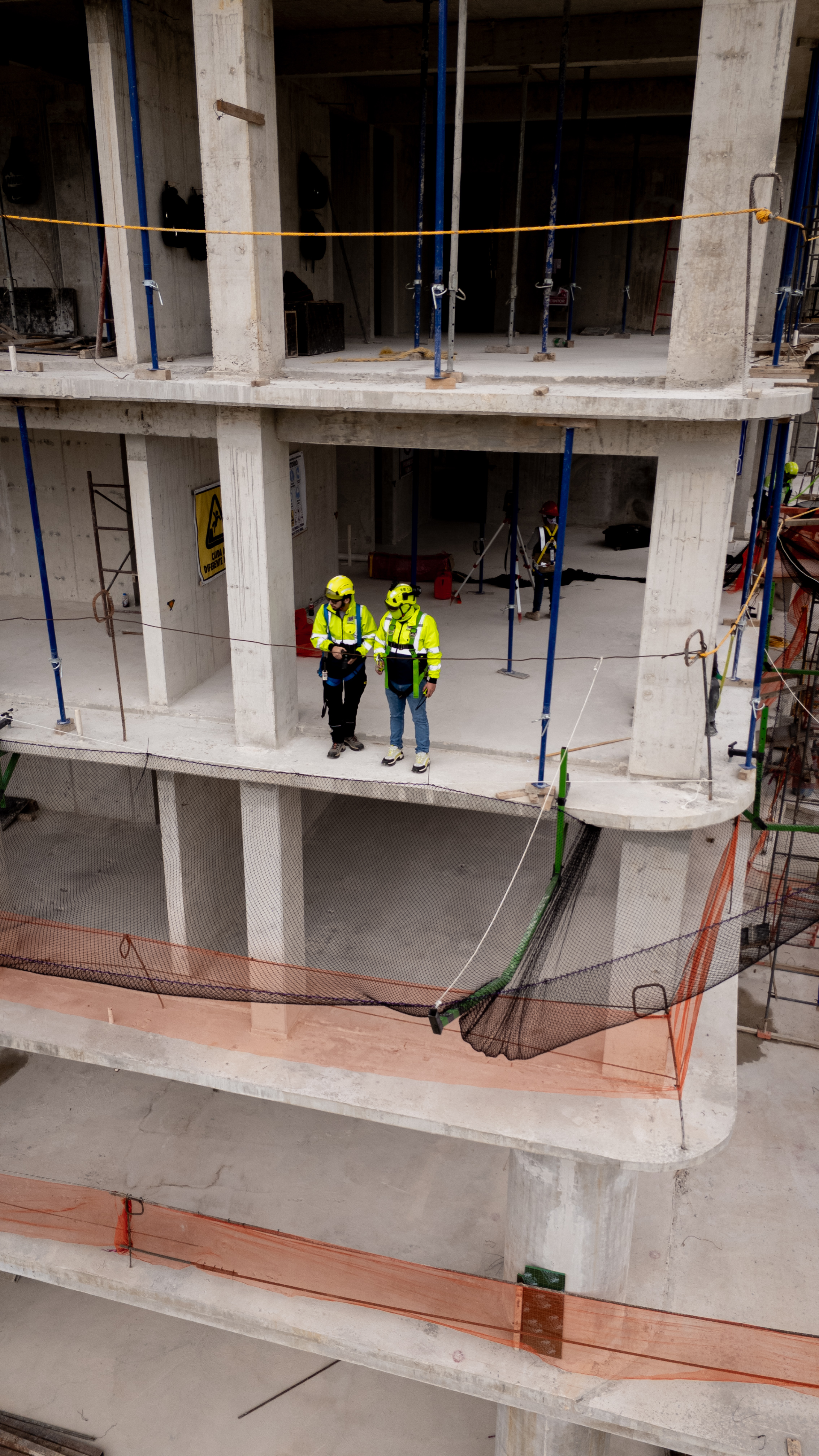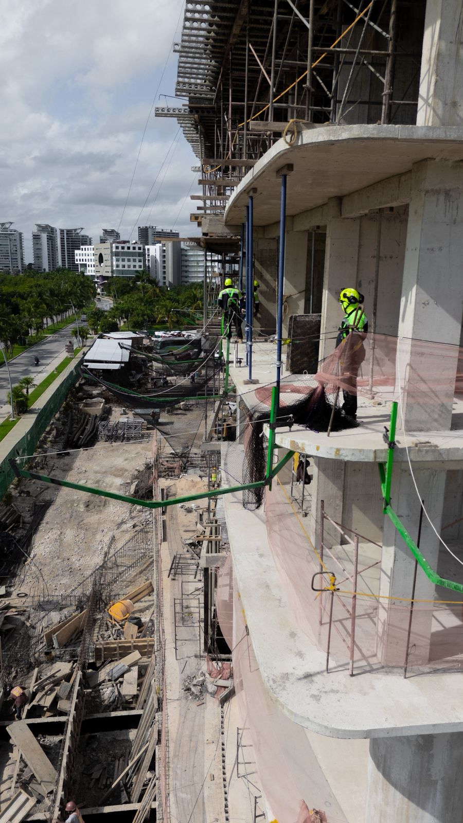 Se llevó a cabo la instalación del sistema de redes anticaídas tipo T en la obra CALA 27, ubicada en Puerto Cancún, con el objetivo de brindar protección colectiva a los trabajadores durante las actividades en altura.